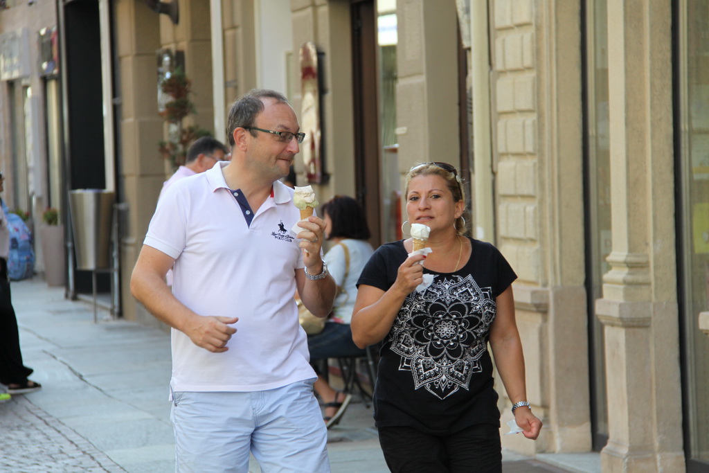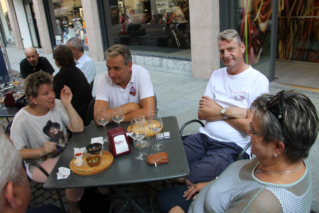 Nach der Ankunft und Bezug der Zimmer gab es Freizeit bis zum gemeinsamen Nachtessen. Diese wurde wohl von den meisten ähnlich genutzt, da doch ein Grossteil der Teilnehmer sich irgendwie, irgendwann dann in der schönen Altstadt von Alba beim Apéro wieder traf. Die einen oder anderen fanden noch Muse für Einkäufe und natürlich auch für den Genuss von Gelati. Programmgemäss fanden wir dann alle unseren Weg ins Hotel Castelli, wobei im Foyer für einige doch schon wieder eine Apéropause fällig war. Mit mehreren Liftfuhren fanden dann alle den Weg ins Dachgeschoss, wo unser erstes gemeinsames Diner geplant war. Eine herrliche Terrasse mit Aussicht über Alba empfing uns, genauso wie ein grosser Speisesaal mit schön gedeckten Tischen. Mit etwas Geduld, fanden alle einen Platz und nachdem unsere Organisatoren das Essen bereits bestimmt hatten, mussten nur noch die passenden Getränke ausgesucht werden. Das Menu startete mit einem Vitello Tonnato, gefolgt von einem sämigen Risotto mit Gemüse, getoppt von Gemüse mit … (Larry lag unsere ausreichende Vitmaminzufuhr am Herzen!) und einem italienischen Schokoladenpudding zum Dessert, den allerdings bereits der eine oder andere mangels Platz im Gedärm ausliess. Begleitet wurde das feine Mahl natürlich von reichlich interessanten Fachgesprächen, Klatsch, Anekdoten aus früheren Zeiten, inklusive der Erinnerung an Vito’s Abwege beim letzten Piemontausflug sowie der interessanten Erzählung über die eine oder andere Kennenlernstory. Nicht zu vergessen natürlich eine Autoshow, welche von der Terrasse aus bestaunt werden konnte während der Rauch- oder Frischluftpausen. Die Bewohner des Savonas durften dann noch einen kurzen Verdauungsspaziergang durch die Altstadt antreten, bevor auch sie, ganz nach Bedarf, den wohlverdienten Schönheitsschlaf antreten konnten.