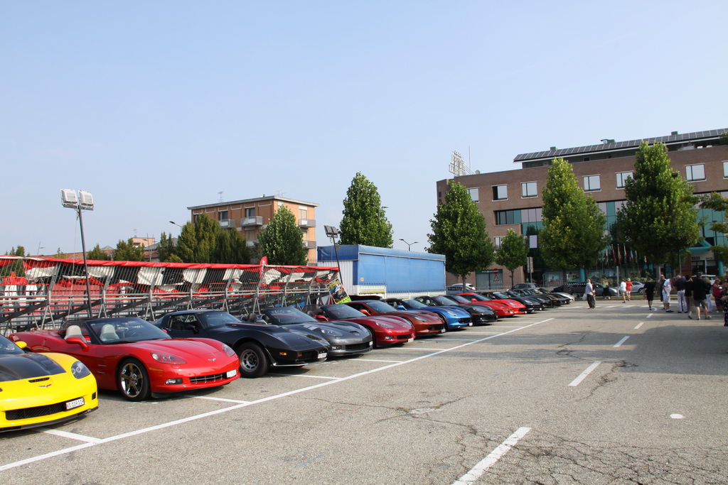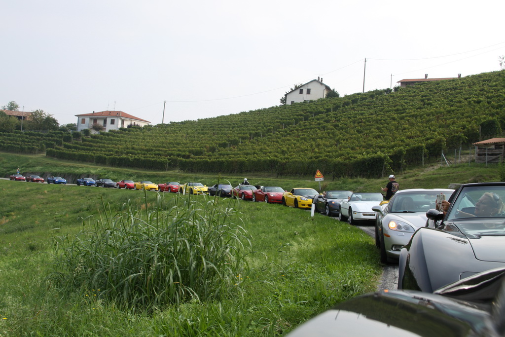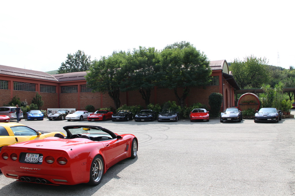Angeführt von Larry und Bea, dem Organisatorenduo, das den Weg aus dem Piemont, welches sie ja bereits seit einigen Tagen unsicher gemacht hatten, nochmals zurück in die Schweiz gekommen waren, ging die Fahrt also los, in das heiss ersehnte Wochenende in Bella Italia. Weiterhin vom Stau verschont, ging die Reise über die Grenze in Chiasso, durch div. Mautstellen, wobei immer wieder auf alle Schäfchen gewartet wurde, bis zu unserem Zielort Alba, im Piemont. Larrys Plan, vor dem Hotelbezug noch einen allgemeinen Tankstopp zu machen, ging leider in die Hose, da wir, um eben trockene Hosen zu behalten, bei der Pipi-Pause diesen nicht mitgekriegt hatten und brav unseren programmierten Navis folgten. Trotzdem fanden alle ihr zugeteiltes Hotel und ich denke es wurden auch noch alle Autos betankt, da ich von einer Benzinpanne nichts gehört habe. Die grössere Herausforderung war wohl der richtige Parkplatz, vor allem im Hotel Castelli. Im Hotel Savona hatten wir ja quasi einen Privatparkplatz hinter einem grossen Holztor im Innenhof. Aber auf dem riesigen öffentlichen PP vor dem Castelli stellte sich die Frage, ob die Corvetten am Samstag dann Teil des Gemüsemarktes sein würden, oder ev. den Platz gar nicht würden verlassen können. Aber auch dies wurde italienisch elegant gelöst, mit Parkieren ausserhalb des Platzes auf der Seite, nur nicht auf den gelben Streifen, gemäss Aussage des Carabinieri, welcher wohlweislich zu Rate gezogen worden war.