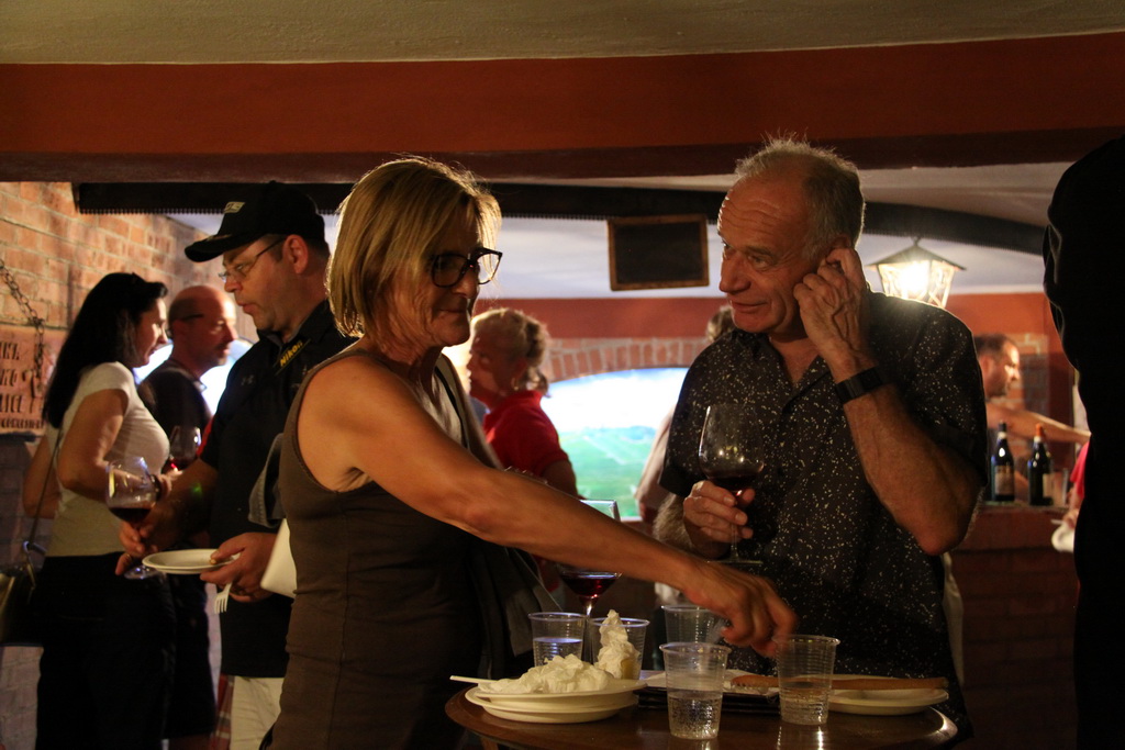 Jeder Besucher wurde mit einem DingDong empfangen, egal ob mit Corvette, Volvo (etc.), Fahrrad oder zu Fuss das Tor passiert wurde. Nach einer herzlichen Begrüssung durch 2 Mitglieder der Familie Falcone und einer kurzen Einführung auf dem Platz, folgte eine Führung vorbei an alten Zeitzeugen durch die Keller bis zu den Eichenfässern, in welchen das flüssige Gold lagert. Trotz der eindringlichen Warnung von Larry, dass wir nicht zu viel essen sollten, da uns ein reichhaltiges Diner erwarten würde, war der Magen von einigen schon ziemlich laut am knurren und man gewann den Eindruck, dass das erste Interesse bei der folgenden Degustation, mehr dem ebenfalls gereichten Schinken, Käse und Focacchia galt, als dem Wein. Dies änderte sich nach dem gestillten Hüngerchen und das Interesse an den gereichten 5 verschiedenen Kelterungen wurde immer grösser. Es war interessant zu sehen, wie verschieden die Geschmäcker doch sind. Auf jeden Fall ging danach der eine oder andere Karton Traubensaft über die Verkaufstheke, trotz den eingeschränkten Kofferraum-verhältnissen der Vetten, für einmal waren die Fremdgänger eindeutig im Vorteil. Entlassen wurden wir alle mit einer lasche Barbera, spendiert vom CUS, welche uns, beim Genuss derselben, bestimmt an den schönen Ausflug erinnern wird. Der Rückweg zu den Hotels wurde individuell angetreten, war zum Glück nur sehr kurz und der eine oder andere Fahrer nutzte die Gelegenheit, sein Fahrzeug wieder einmal etwas zu kitzeln.