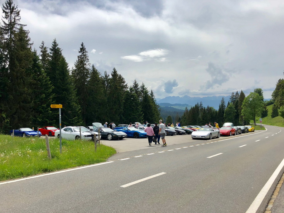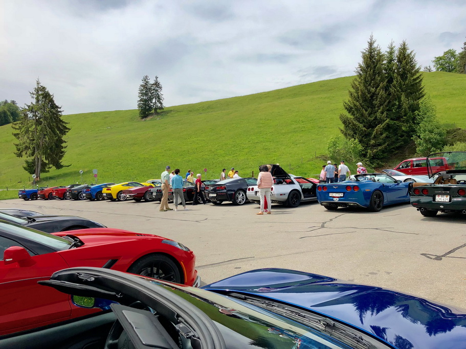 Da wir ziemlich viele Autos waren und dies eine gut befahrene Strecke mit vielen Baustellen war, war es eine Herausforderung zusammen zu bleiben. In Heimberg hat es unsere Gruppe dann gesprengt. Ein Kreisel hat eine Einfahrt und drei Ausfahrten. Unser Convoi hat alle drei Ausfahrten als Variante genommen. Alle Wege führen bekanntlich nach Rom, in unserem Fall nach Schallenberg. Ich fuhr als letzter und war eigentlich vorgesehen alle Corvetten beisammen zu halten. Da alle drei Ausgänge im Kreisel nach verschiedenen Richtungen gingen und die vier Corvetten vor mir jede in eine andere Richtung fuhren, entschied ich mich der vor mir fahrenden Corvette zu folgen. Da der Fahrer im unübersichtlichen Kreisel die glorreiche Idee hatte einmal rum herum zu fahren, habe ich auch den aus meiner Sicht verloren. Da Schallenberg gross angeschrieben war und ich die genaue Route nicht kannte, habe ich mir für diesen Weg entschieden. Kurz darauf habe ich Larry beim Tanken gefunden. Auch er und Bea hatten die gleiche Idee wie ich. Schliesslich kamen auch noch andere auf die gleiche Idee und so kam es, dass die sechs letzten Fahrzeuge von unserer Truppe zusammen als erste am Schallenberg ankamen. Später folgten wieder kleinere Gruppen. So kam es, dass wir so ziemlich in umgekehrter Reihenfolge als beim Start angekommen sind. Auf dem Schallenberg haben wir dann je nach Laune etwas zu Mittag gegessen oder wie wir die köstlichen Erdbeertorten und Coupe Romanofs genossen.