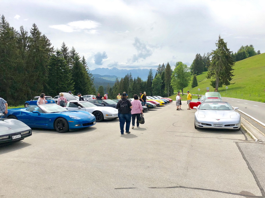Es war schönes Wetter und ein heisser Tag wurde erwartet. Als alle angemeldeten Teilnehmer eingetroffen waren, 36 Mitglieder und 4 Hunde mit insgesamt 24 Corvetten ging es los Richtung Bern. Wir fuhren auf der Hauptstasse via Münsingen nach Thun. Ziel war der Schallenberg.
